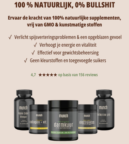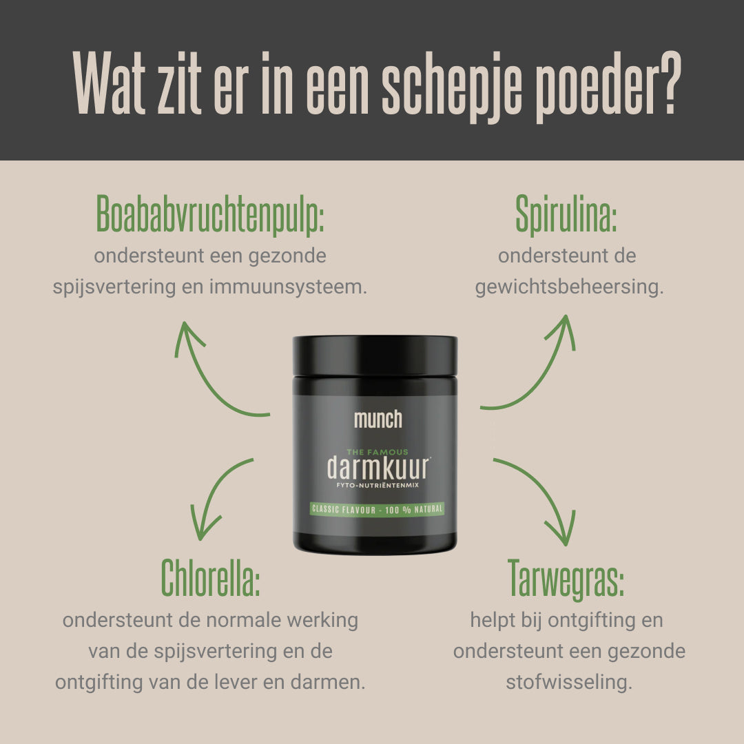De Munch Darmkuur is een natuurlijke mix van superfoods en draagt bij aan het herstel van de darmflora, reinigt het lichaam en helpt bij gewichtsbeheersing.
