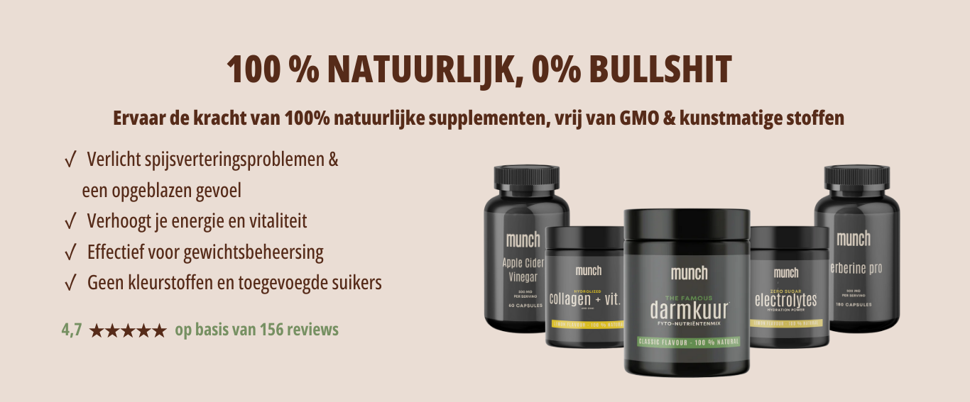 Bij Munch maak ik pure supplementen die precies doen wat ze beloven. Zonder suiker, zonder zoetstoffen, zonder vulmiddelen. Functioneel, effectief en vooral: je voelt snel resultaat, omdat elke formule bestaat uit ingrediënten waarvan studies laten zien dat ze écht werken.