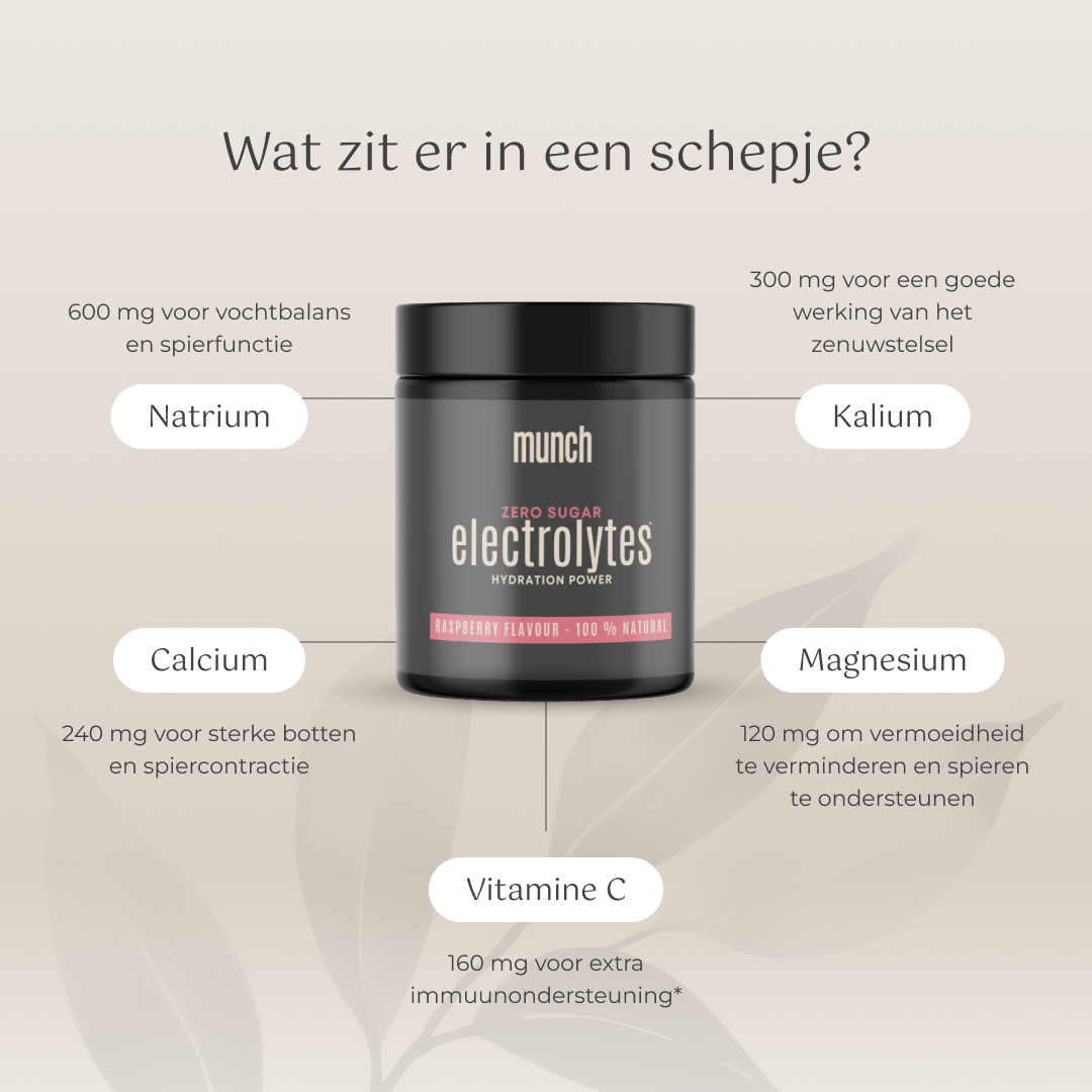 Munch's Electrolyte Formula combines essential minerals with vitamin C in a refreshing, light raspberry flavored powder that is virtually tasteless and dissolves easily in water.