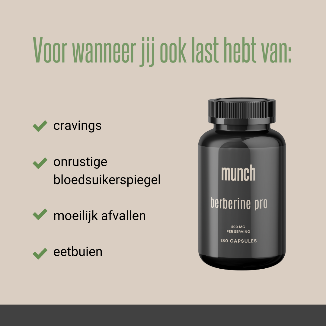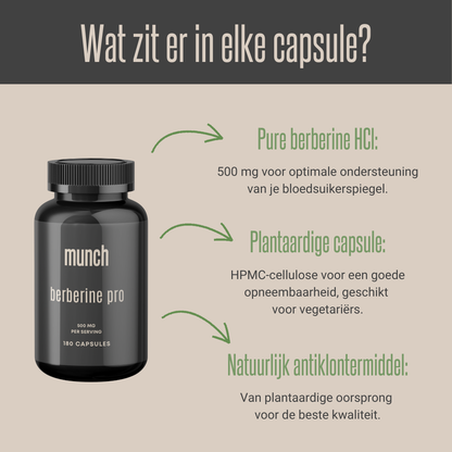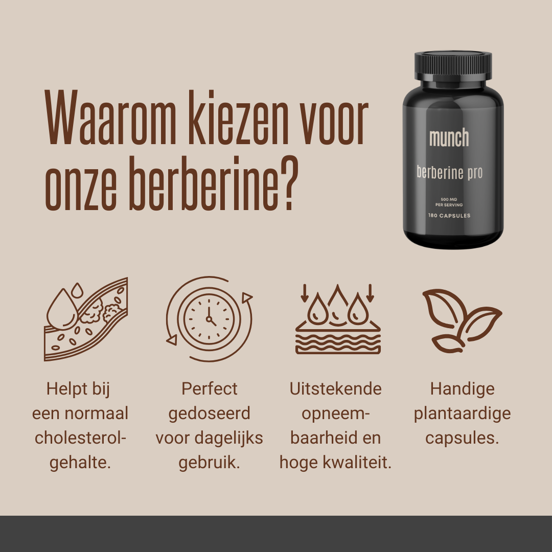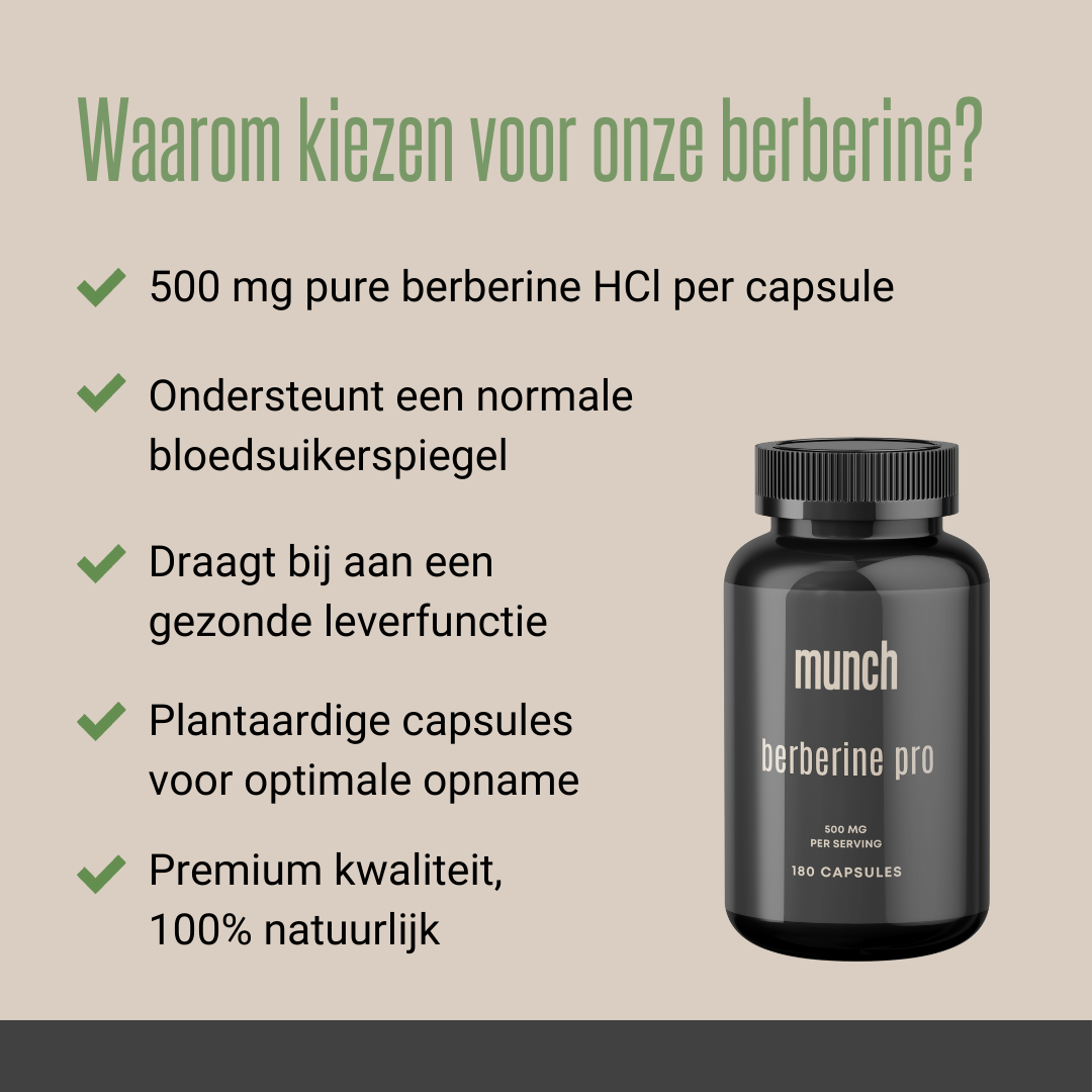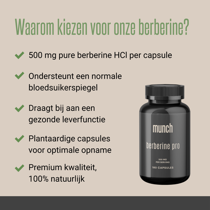 Berberine Pro de Munch contient 60 gélules de berbérine pure à un dosage optimal. Cette formule naturelle est idéale pour ceux qui cherchent à maintenir une glycémie normale.*
