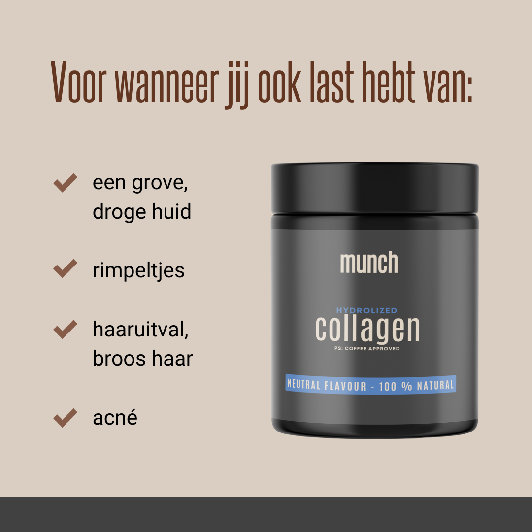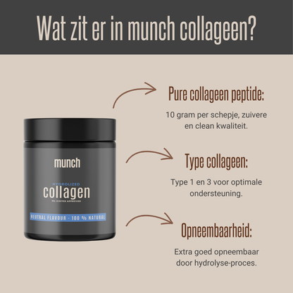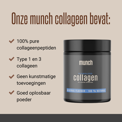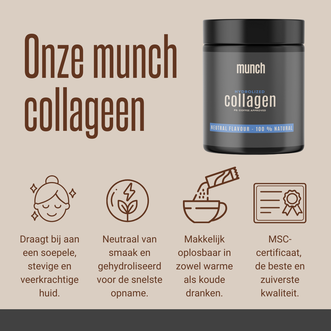 Le collagène hydrolysé de Munch est une poudre de collagène de qualité supérieure au goût neutre . Il se dissout parfaitement dans les boissons chaudes et froides, ce qui le rend facile à ajouter à votre café, thé ou smoothie quotidien. C'est la forme la plus rapidement absorbée.