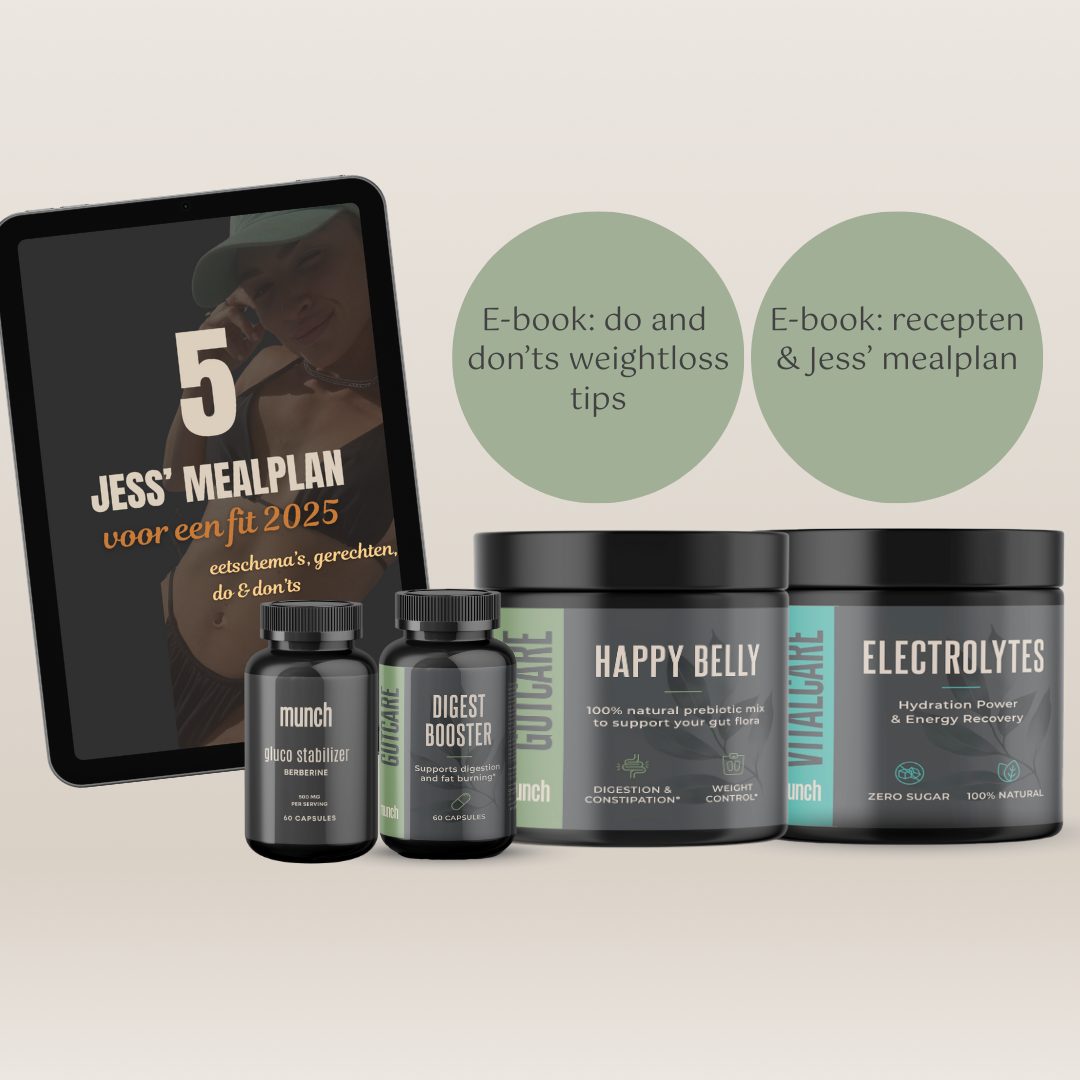 4 supplementen: Happy belly (darmkuur), Digest booster, berberine 180 capsules, electrolytes.